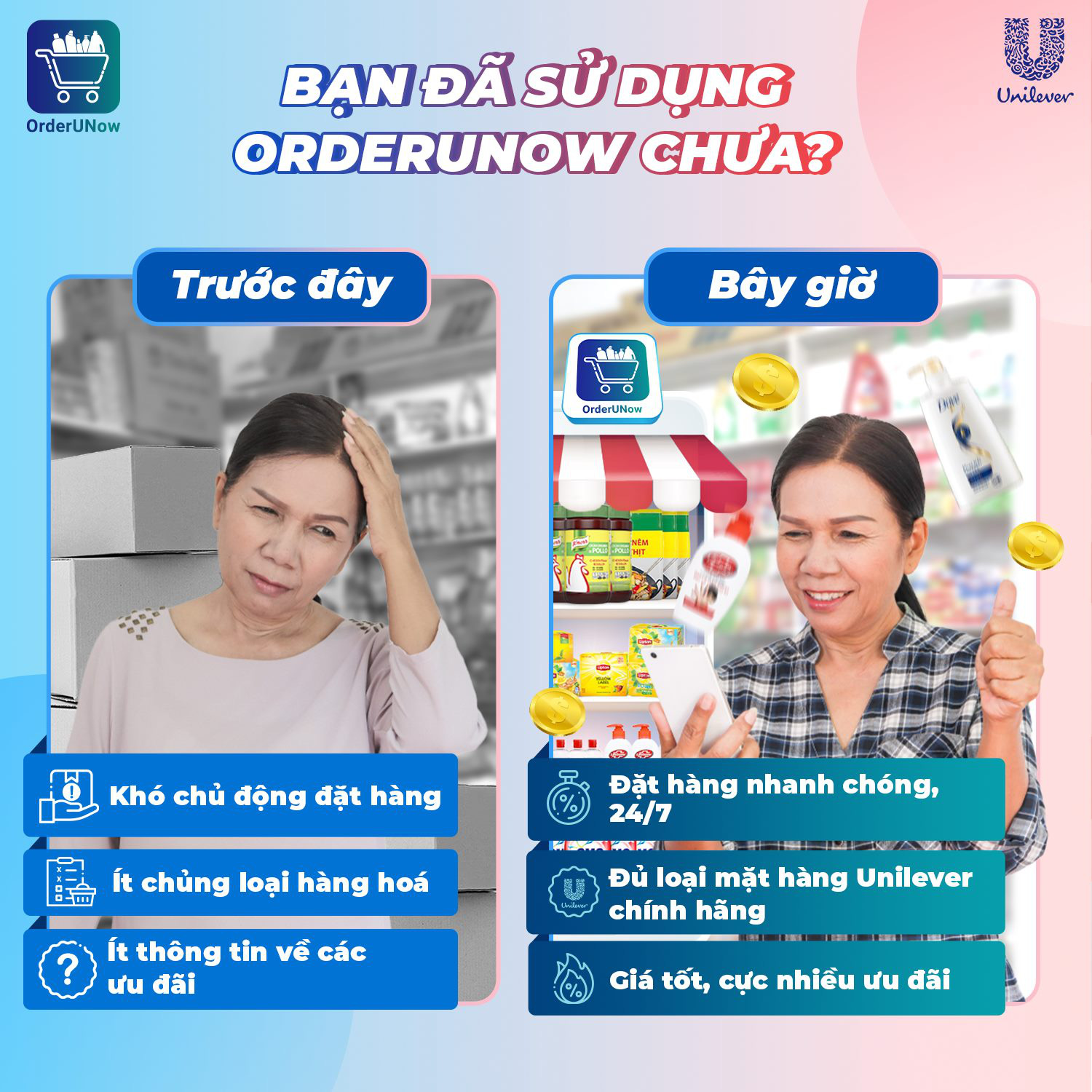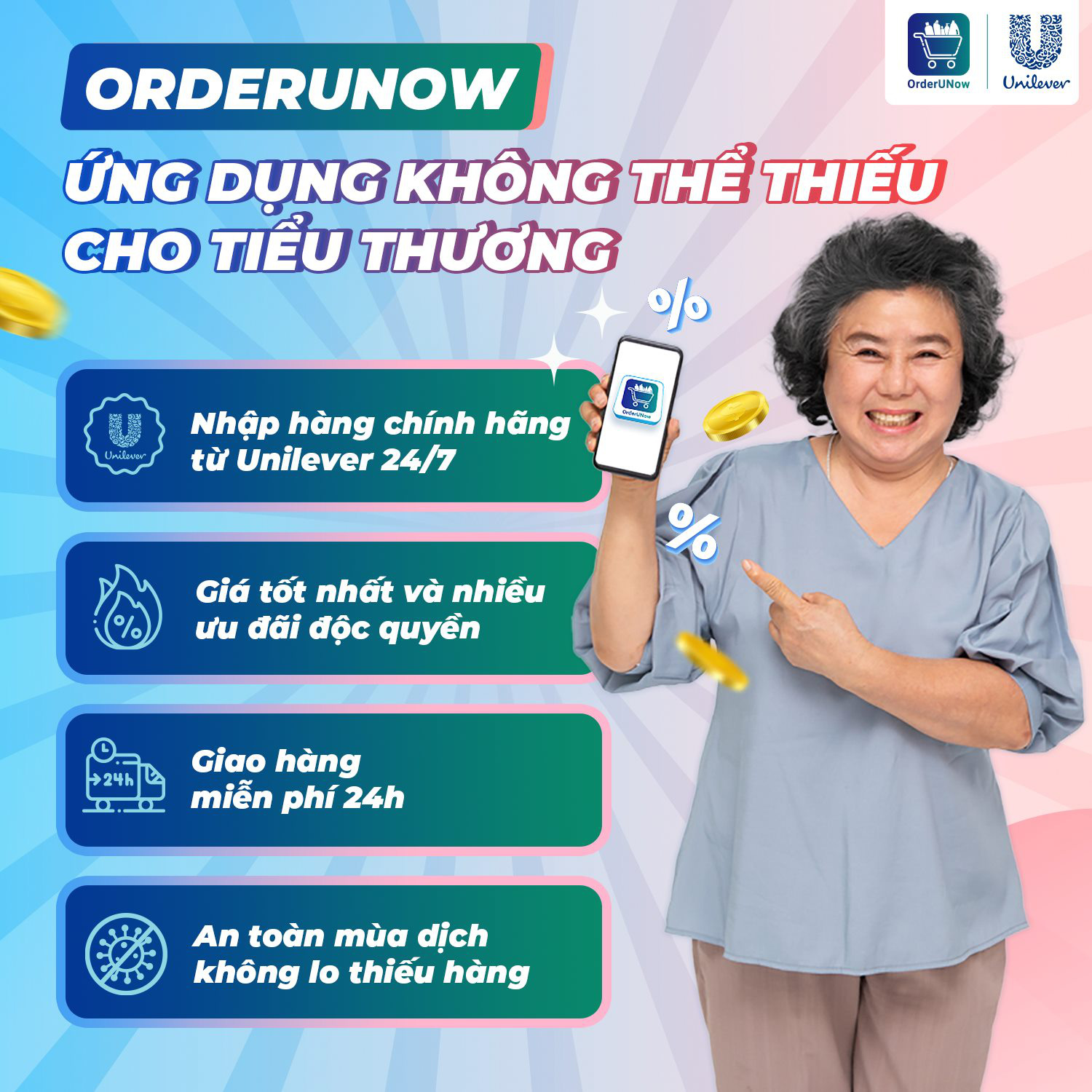 Thông qua cài đặt và sử dụng ứng dụng OrderUNow trên di động, các tiểu thương có thể nhập hàng chính hãng từ Unilever 24/7 với giá tốt, đa dạng mặt hàng và nhiều ưu đãi độc quyền, đặc biệt giao hàng miễn phí 24h, cũng như đảm bảo nguồn hàng ổn định và an toàn mùa dịch.
