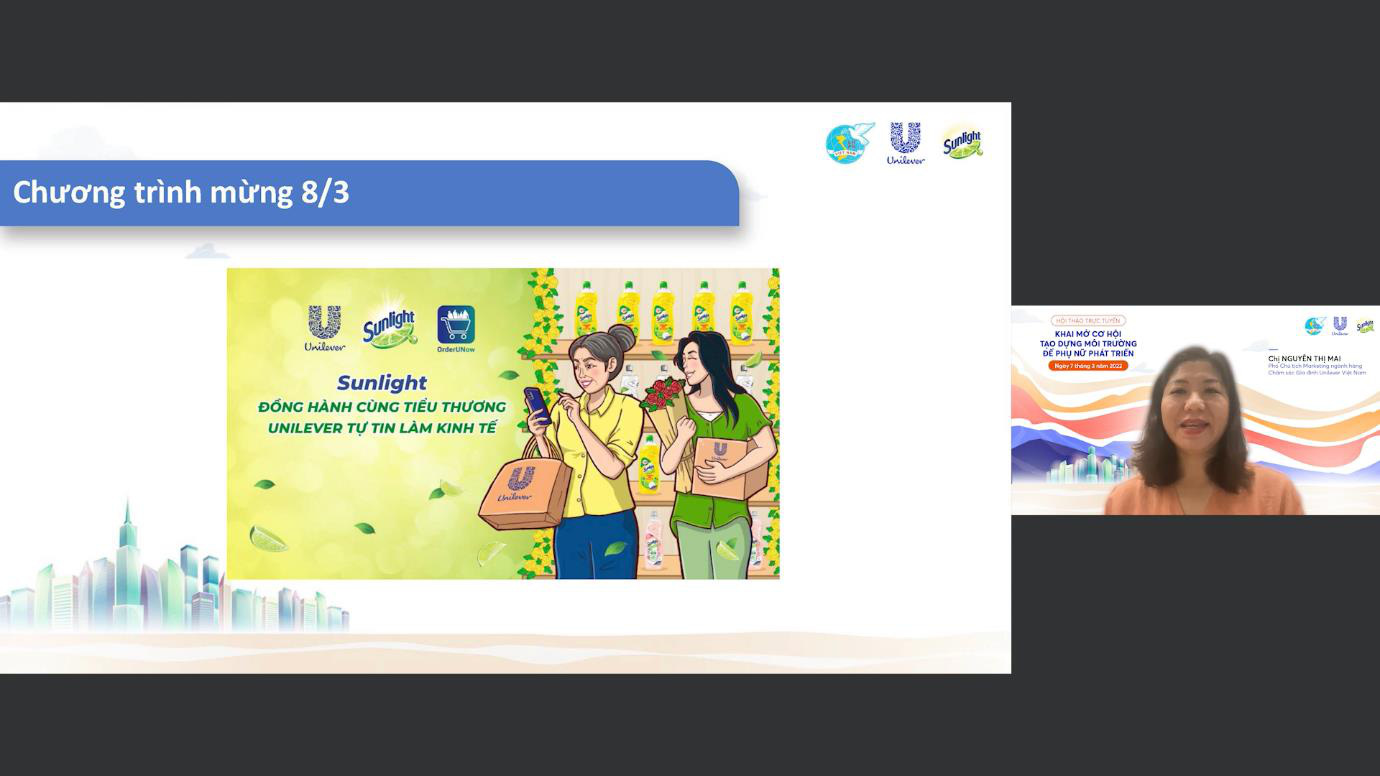 Cụ thể, năm 2021, Unilever phối hợp cùng Google với sáng kiến WomenWill để tổ chức các lớp học trực tuyến về kiến thức kỹ năng kinh doanh, khởi nghiệp cho phụ nữ, giúp nhiều phụ nữ được tiếp cận với kiến thức và cơ hội kinh doanh với sự hỗ trợ của công nghệ thông tin với gần 45.000 phụ nữ được đào tạo trực tuyến và trực tiếp thông qua chương trình “Phụ nữ Việt tự tin làm kinh tế”.
