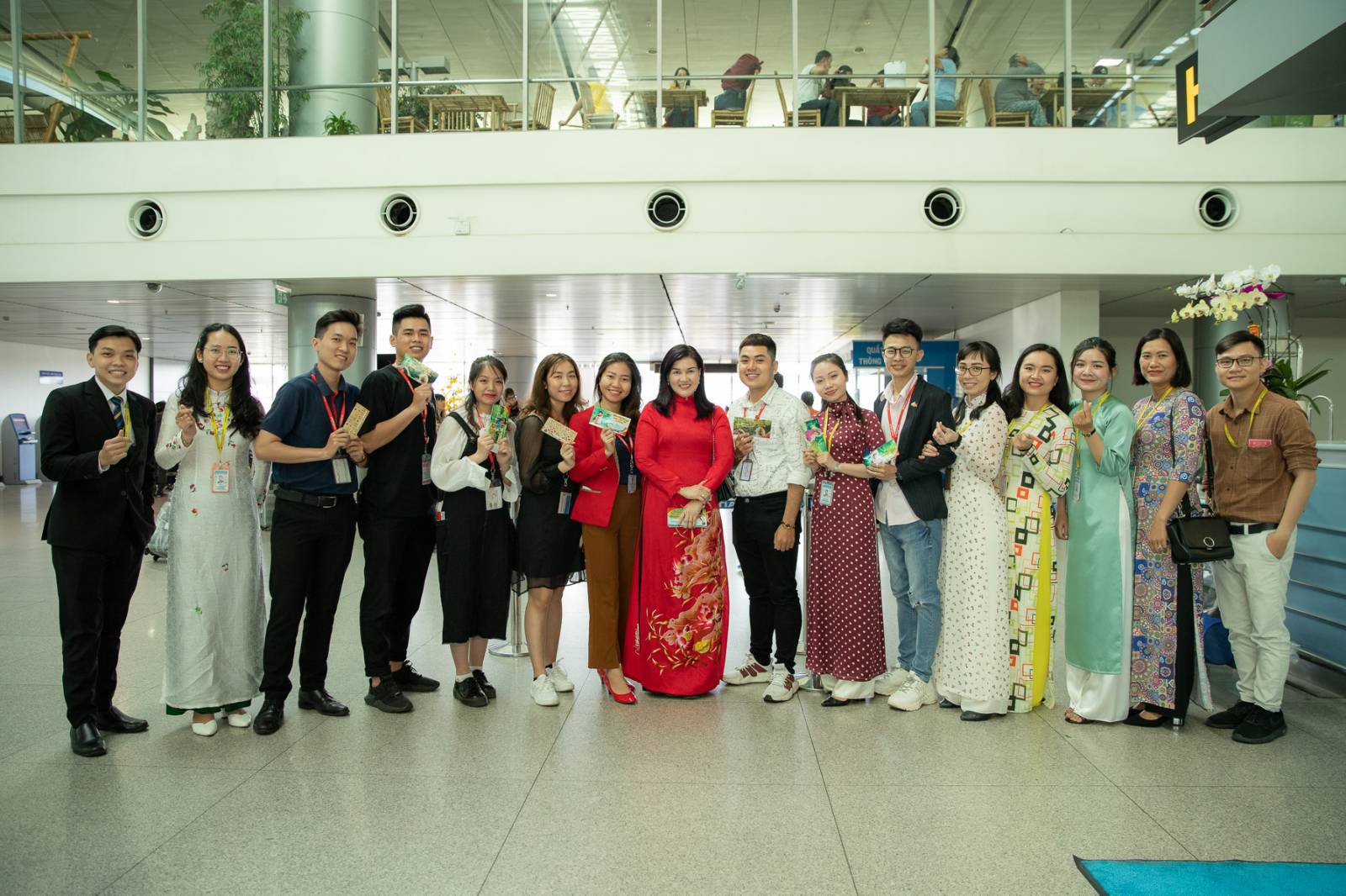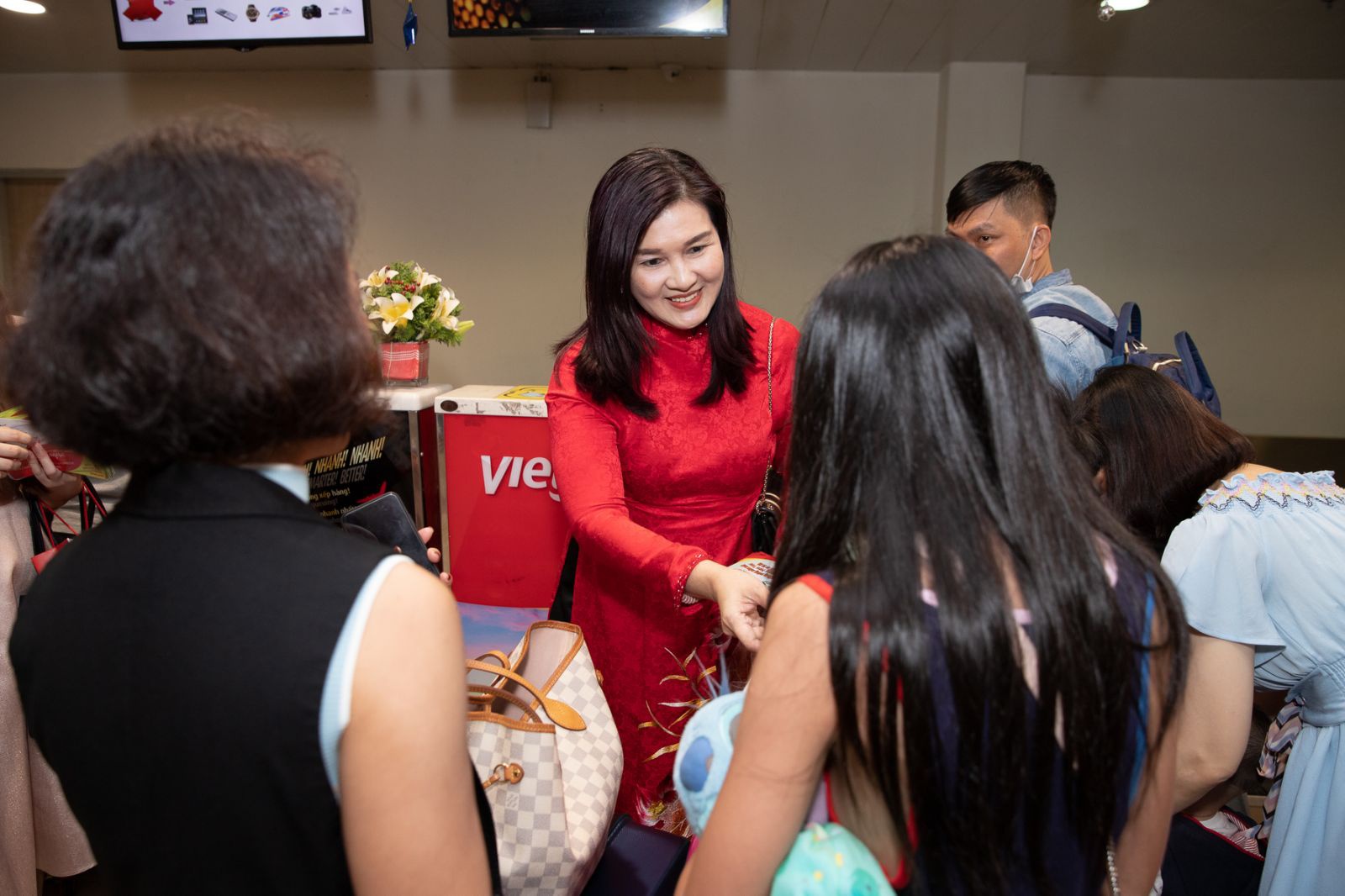 Nữ lãnh đạo của hàng hàng không ân cần thăm hỏi và chúc hành khách có những chuyến bay thú vị
