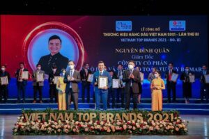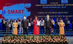 Bên cạnh các thương hiệu có danh tiếng và bề dày lịch sử như Vissan, Viet A Bank, Vigracera, DCI, Đất Xanh, Hòa Phát,… đáng chú ý trong danh mục Top thương hiệu hàng đầu Việt Nam năm 2021 có sự hiện diện của B-Smart là học viện có những hoạt động tiêu biểu trong lĩnh vực giáo dục đào tạo, được hội đồng thẩm định bình xét và trao tặng cú đúp giải thưởng: Thương hiệu B-Smart – Top 50 thương hiệu hàng đầu Việt Nam và Chủ tịch HĐQT Nguyễn Đình Quân được vinh danh Nhà lãnh đạo xuất sắc năm 2021.