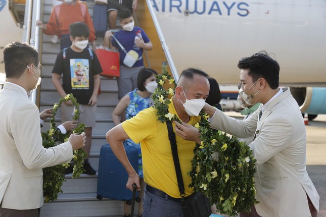 Hành khách tham gia chuyến bay nhận hoa chào mừng từ đại diện Bamboo Airways