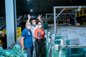 Nghệ sĩ Cát Tường và Lê Dương Bảo Lâm tham quan trung tâm phân loại TP HCM với sự hướng dẫn của anh Lê Trọng Hoàng (trái), Quản lý trung tâm.