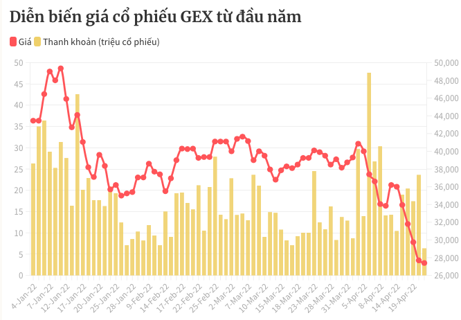 Cổ phiếu Gelex liên tục bị bán tháo sau khi xuất hiện tin đồn thất thiệt liên quan đến ông Tuấn tuần đầu tháng này. Hiện tại, cổ phiếu GEX giao dịch quanh mức 27.000 đồng, giảm hơn 32% so với đầu tháng 4.