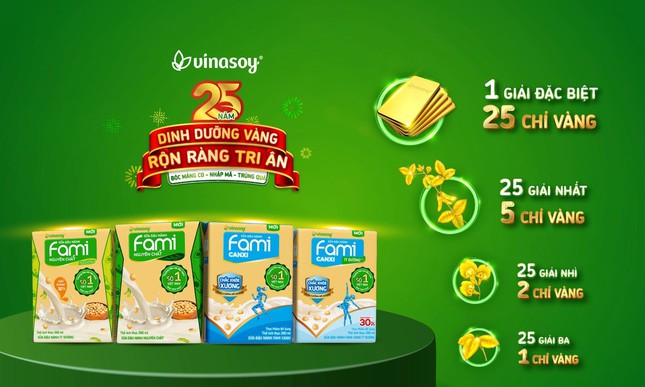 Mừng 25 năm phát triển, Vinasoy dành tặng 225 chỉ vàng cho khách hàng cùng hàng vạn quà tặng trực tiếp khác trị giá lên đến 6 tỉ đồng. Sau livestream đầu tiên, từ nay đến hết tháng 5/2022, còn 185 chỉ vàng đang chờ đón các khách hàng may mắn.