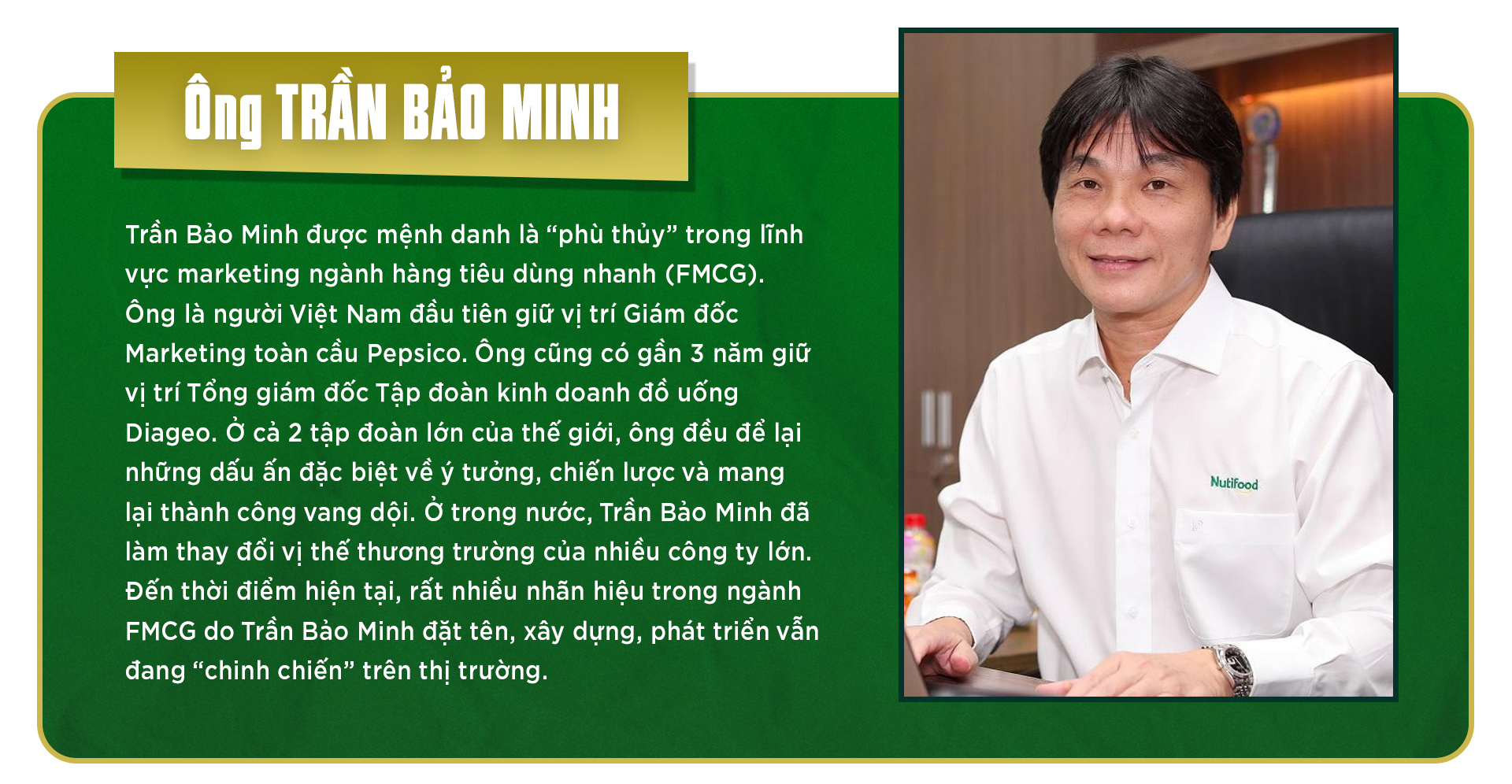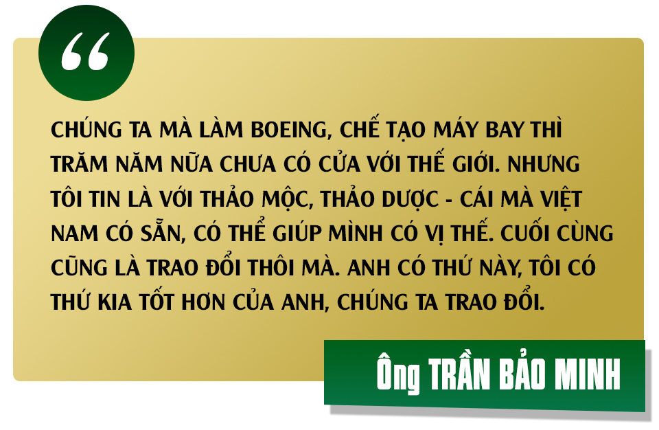 Ông Trần Thanh Hải, Chủ tịch HĐQT Nutifood, nói với tôi, “lá phiếu” của Trần Bảo Minh là yếu tố quan trọng khiến Nutifood quyết định đầu tư vào sâm Ngọc Linh. Cú rẽ trái của Nutifood sang các loại nước giải khát bổ dưỡng mang thương hiệu NutiZen cũng là dấu ấn của Trần Bảo Minh khi cập bến Nutifood. Nhưng ít ai biết rằng, Trần Bảo Minh “đến” với dược liệu quý nói riêng và thảo mộc nói chung đều ở những tình huống bất đắc dĩ. Lần đầu khi Minh đưa mẹ đi du lịch Hàn Quốc, trong tour buộc phải đến một cửa hàng sâm. Tự nhận mình là “trùm” về dụ dỗ người khác mua hàng nhưng khi đó Trần Bảo Minh chỉ còn biết đứng nhìn cô nhân viên dẫn mẹ mình đi mất hút và “cà thẻ thôi rồi”. Minh cũng đã chứng kiến cảnh “cả thế giới đến và ra về với những va li sâm”. Nhưng ở thời điểm đó, Trần Bảo Minh chỉ nghĩ đơn giản, với những người lớn tuổi, cái gì tốt cho sức khỏe, họ sẵn sàng mua với mọi giá. Còn Minh không dùng vì “hồi trẻ tôi không thấy thực phẩm tốt cho sức khỏe là quan trọng”. Lần thứ hai thì không còn chứng kiến, Minh đã sử dụng nấm đông trùng hạ thảo (do Việt Nam trồng) nhưng là để ủng hộ anh bạn hàng xóm khởi nghiệp chứ cũng chưa phải tự nguyện. Đó là năm 2017, cái năm mà sau này Trần Bảo Minh chiêm nghiệm và đúc kết “có những thời điểm trong cuộc đời con người chỉ toàn điều tệ ập đến, từ công việc, sức khỏe, những mất mát”. Sức khỏe giảm sút đến mức Trần Bảo Minh nghĩ mình bị ung thư. Con gái còn nhỏ, Minh không dám kiểm tra. “Thôi kệ, nếu bị thật thì đến lúc đó tính. Giờ phải giải quyết cuộc sống đã”, Minh chặc lưỡi. Nhưng cuối cùng cũng có người bạn thuyết phục được Trần Bảo Minh đi khám và kết quả là anh… không bị gì. Suốt quãng thời gian đó, Minh vẫn cứ mỗi sáng một ly, mỗi tuần một hũ đông trùng hạ thảo ngâm mật ong… để ủng hộ anh bạn hàng xóm. “Mà nó tốt thật mới ghê. Từ sắc mặt đến sức khỏe, đều tốt lên”, Minh nói đã uống được hơn 4 năm. Và giờ thì Trần Bảo Minh là “tín đồ” của những loại thảo dược, thảo mộc tự nhiên. Thậm chí, Minh còn nâng nó lên một bậc khi gọi đó là “duyên lành”. “Tự dưng mình gặp người đó, làm cái đó, mình uống và mình khỏe. Chẳng duyên thì là cái gì”, Minh cười sảng khoái. Lần này Trần Bảo Minh cũng phát hiện ra một “chân lý”, rằng những thứ ở trong tự nhiên rất tốt cho sức khỏe. Phát hiện không mới nhưng cách tư duy của Minh lại khiến cho người khác phải nghiêng mình: “Nếu nó quá đắt thì mình phải vận dụng công nghệ, kỹ thuật làm sao để nó rẻ xuống, ứng dụng vào nhiều sản phẩm khác nhau để nhiều người có thể hưởng thụ cái sự tốt đó. Đấy mới là việc có ý nghĩa”.