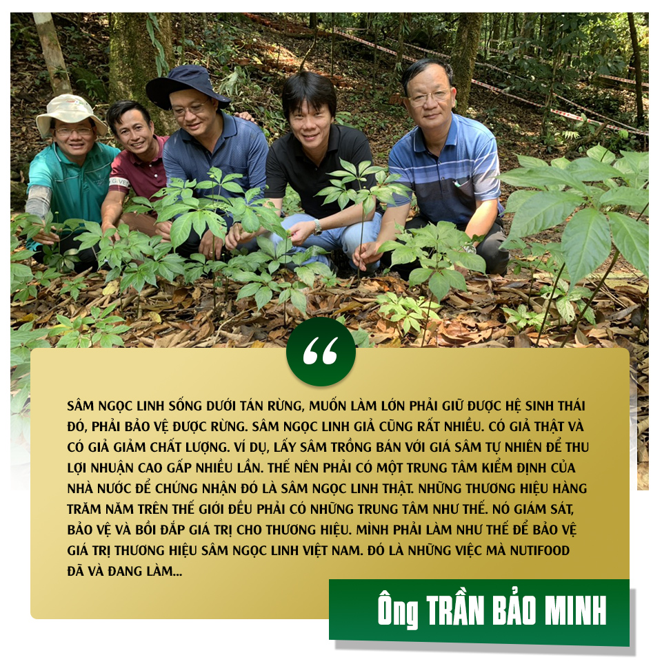 “Tuần sau chúng tôi nhập công nghệ blockchain để làm tiểu sử cho củ sâm từ lúc sinh ra cho đến lúc đi ra khỏi cửa hàng. Muốn làm thương hiệu, thì phải bảo đảm được tính trung thực của thương hiệu đó. Thương hiệu đó phải bảo chứng cho người sử dụng là họ đang dùng sâm Ngọc Linh thật…”, Minh vẫn nói không ngớt, đó là 16 giờ 8 phút một chiều cuối năm. Cũng trong tuần sau đó, Minh và Ban lãnh đạo Nutifood có chuyến lên Kon Tum, tìm kiếm cơ hội về sâm và thảo dược quý. Rồi phối hợp với chính quyền để chuẩn hóa lại trung tâm kiểm định chất lượng sâm Ngọc Linh; xây dựng các phiên đấu giá quốc tế; các cửa hàng để du khách có thể đến xem, mua và tìm hiểu “quốc bảo” Việt Nam; ra mắt miền thảo mộc NutiZen, xây dựng hệ thống “Ngôi nhà dinh dưỡng Nutifood”…