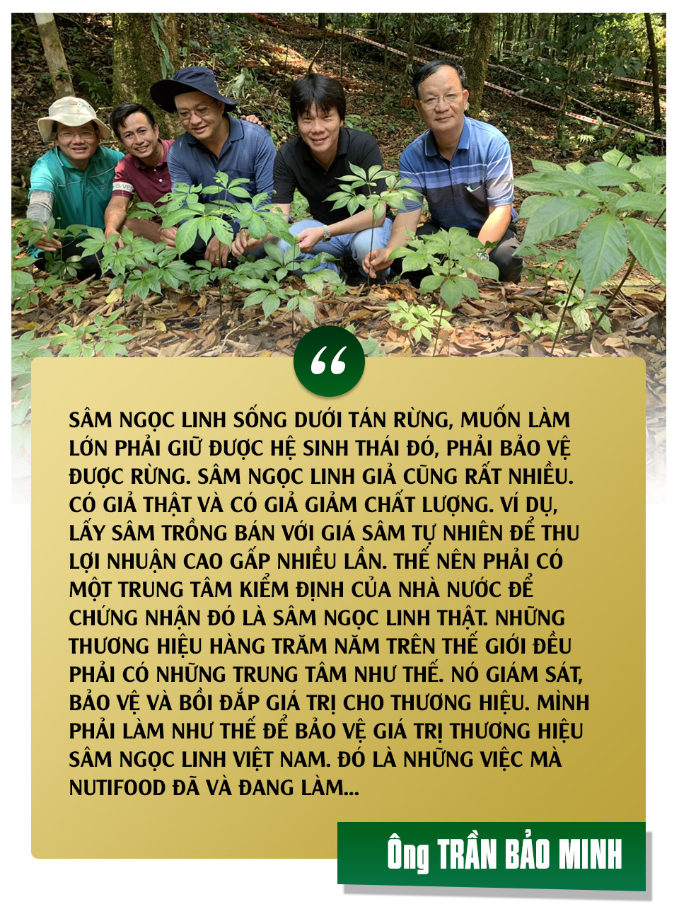 Minh thì bảo, anh bỏ marketing đã một thập kỷ rưỡi có lẻ, anh từng đến với những công ty “không có gì, kể cả tiền” và từ cách đây nhiều năm, anh đã muốn “rửa tay gác kiếm”. Nhưng cuộc gặp với tôi một chiều cuối tháng 11.2021, Trần Bảo Minh, Phó chủ tịch HĐQT Công ty Nutifood kiêm Chủ tịch HĐQT Công ty CP Thương mại – Dược – Sâm Ngọc Linh Quảng Nam (Quasapharco) vẫn say sưa nói về sâm Ngọc Linh, về miền thảo mộc mang tên NutiZen, về thế giới NuVi… chẳng thấy chút bóng dáng nào của cái việc “anh không muốn làm nữa” mà Minh nói đi nói lại một cách hết sức chân thành.