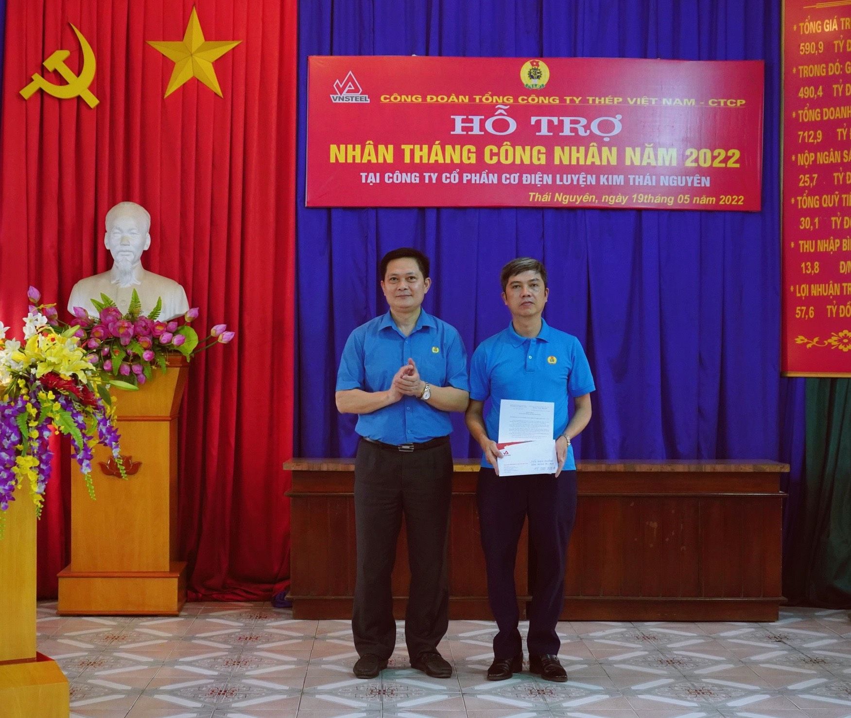Với tinh thần tri ân người lao động nhân Tháng Công nhân, Chủ tịch Công đoàn Tổng công ty Thép Việt Nam – CTCP – ông Vương Duy Khánh – đã đánh giá cao công trình chào mừng của tập thể người lao động Công ty CP Cơ điện luyện kim Thái Nguyên, ghi nhận tinh thần lao động sáng tạo của những con người nơi đây. Công đoàn Tổng công ty Thép Việt Nam-CTCP đã trích 15 triệu đồng từ nguồn kinh phí hoạt động của Công đoàn để thưởng cho tập thể công đoàn Công ty CP Cơ điện Luyện kim Thái Nguyên.
