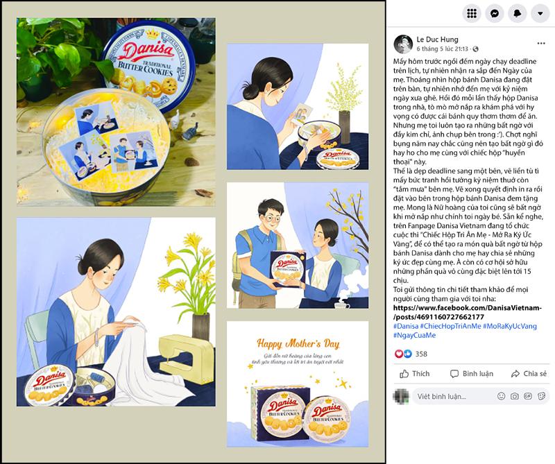 Và bất ngờ hơn là sự góp mặt của nhiều tác phẩm sáng tạo vô cùng độc đáo từ các bạn trẻ tài năng trên mạng xã hội trên chính chiếc hộp thiếc xanh Danisa quen thuộc. Nghệ sĩ trẻ Lê Đức Hùng đã trổ tài hội hoạ, đồng thời kêu gọi người hâm mộ cùng mình tham gia chương trình “Chiếc Hộp Tri Ân Mẹ – Mở Ra Ký Ức Vàng” để trao gửi lòng biết ơn và yêu quý đến “nữ hoàng” của lòng mình.
