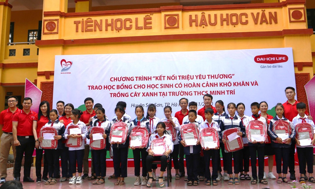 Với mong muốn hỗ trợ các học sinh hoàn cảnh khó khăn trên đường chinh phục tri thức, vào ngày 21.11, nhân dịp Hội nghị Dịch vụ khách hàng khu vực phía Bắc của Công ty BHNT Dai-ichi Việt Nam (Dai-ichi Life Việt Nam), Quỹ Vì cuộc sống tươi đẹp của công ty đã kết hợp triển khai chương trình “Kết nối triệu yêu thương” – tiếp sức đến trường, trao 80 suất học bổng và quà tặng với tổng trị giá 50 triệu đồng, mỗi suất gồm học bổng 500.000 đồng và 1 ba lô, cho 80 học sinh Trường THCS Minh Trí, thôn Thắng Trí, xã Minh Trí, huyện Sóc Sơn, TP.Hà Nội.