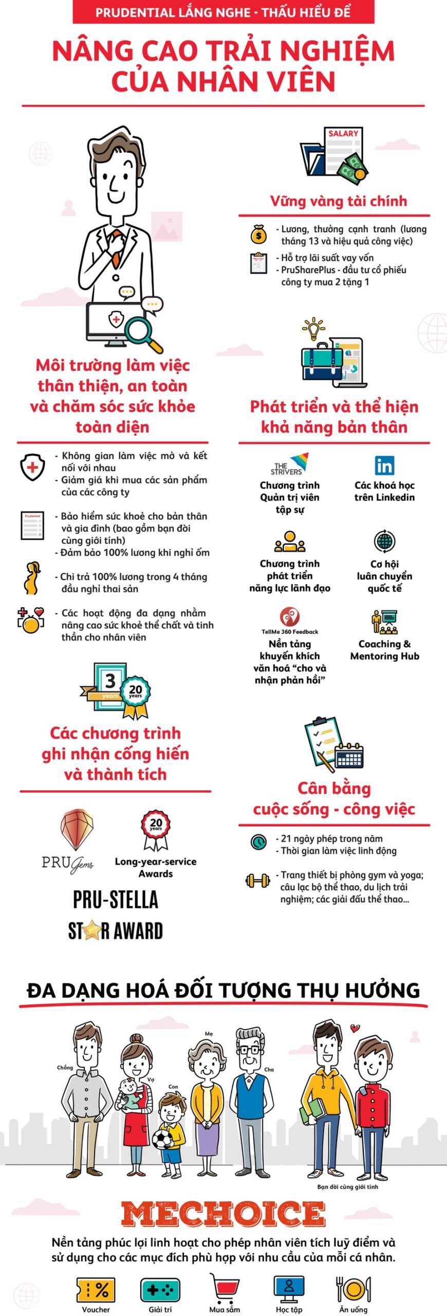Tại Prudential, chính sách phúc lợi và đãi ngộ được cá nhân hóa theo nhu cầu, đa dạng nhóm đối tượng thụ hưởng. Đây là yếu tố quan trọng giúp công ty thu hút, giữ chân nhân sự.