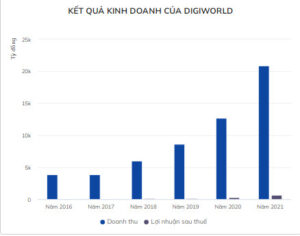 Tính chung cả năm 2021, Digiworld ghi nhận mức 21.350 tỷ doanh thu, tăng trưởng hơn 68% và lợi nhuận sau thuế hơn 658 tỷ đồng, tăng 146% so với cùng kỳ.