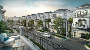 Kiến trúc khu dinh thự ven biển lấy cảm hứng từ phong cách miền Nam California. Đặc trưng kiến trúc vượt thời gian thể hiện qua những ô cửa vòm lớn, hệ cột trụ trang trí, đường gờ hoa văn dưới mái nhà, mái đua và ban công được trang trí bằng hoa văn sắt uốn nghệ thuật. Hai gam màu xám và trắng chủ đạo hài hòa với bầu không khí trong lành nơi vịnh biển.
