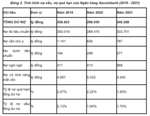 Nợ quá hạn là thước đo quan trọng nhất đánh giá về chất lượng cho vay ngân hàng. Tỷ lệ nợ quá hạn trên tổng dự nợ cho vay của Ngân hàng Sacombank trong giai đoạn 2019 – 2021 nằm trong khoảng từ 1 – 3% và có xu hướng giảm dần. Cụ thể: Năm 2019, tỷ lệ nợ quá hạn của Sacombank đạt 2,57%, năm 2020 chỉ số này giảm xuống chỉ còn 2,22%, giảm 13,89% so với năm 2019. Đến năm 2021, tỷ lệ nợ quá hạn chỉ còn 1,93%, tiếp tục giảm 12,9% so với năm 2020. Đây là một dấu hiệu khả quan, khi nền kinh tế – xã hội đang chịu nhiều yếu tố bất ổn. Trước tình hình này, Ngân hàng đã , điều chỉnh chính sách kịp thời giúp cho tỷ lệ nợ quá hạn của Ngân hàng giảm xuống.