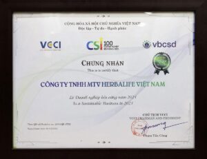 Herbalife VN được vinh danh top 100 doanh nghiệp bền vững tại Việt Nam 2021 theo đánh giá của Phòng Thương mại và Công nghiệp Việt Nam (VCCI).