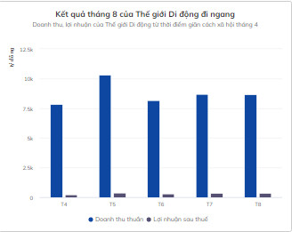 Tập đoàn Thế giới Di động báo cáo doanh thu tháng 8 đạt 8.662 tỷ đồng, lợi nhuận sau thuế 326 tỷ đồng. Kết quả kinh doanh của tập đoàn bán lẻ này đi ngang so với tháng 7 và tăng trưởng 9% doanh thu, 14% lợi nhuận so với tháng 8/2019.