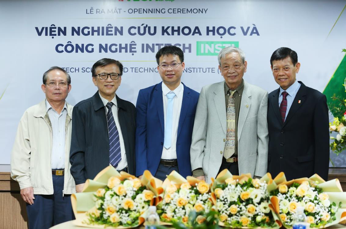 Từ trái qua phải là Thầy Lương Thế Ngọc; PGS.TS Thái Quang Vinh; Chủ tịch HĐQT INTECH Group – Ông Cao Đại Thắng; Tiến sĩ Tạ Quang Ngọc; PGS.TS Trần Gia Mỹ – Viện trưởng Viện INSTI.