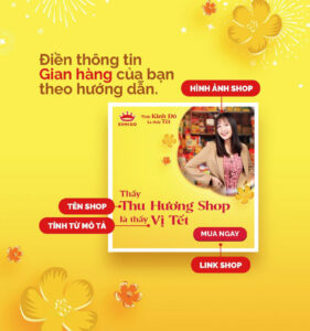 Ngành hàng kinh doanh + Tên gian hàng + Một tính từ miêu tả gian hàng. Ví dụ: ngọt ngào, vị Tết, hấp dẫn, ngon lành,…