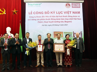 Hôm qua 29-3, Công ty Dược phẩm Traphaco đã tổ chức lễ đón nhận Kỷ lục Việt Nam, dành cho những nỗ lực của Công ty này trong hiện đại hóa thuốc đông dược và 3 dòng sản phẩm đông dược bán chạy nhất, gồm Tottri – bán chạy nhất trong mảng thuốc trĩ đông dược; Hoạt huyết dưỡng não đứng số 1 thị trường thuốc bổ não và vận mạch ngoại biên; Boganic đứng số 1 thị trường thuốc gan mật.