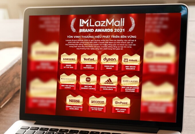 LazMall Brand Awards 2021 vinh danh các thương hiệu có tăng trưởng bứt phá về kết quả kinh doanh và chiến lược tối ưu hóa hệ sinh thái, công nghệ sẵn có trên Lazada. 11 thương hiệu thắng giải gồm Samsung, Tefal, Dyson, Abbott, Fahasa, SkinCeuticals, Xiaomi, adidas, Nestlé, Estée Lauder, Onpoint.