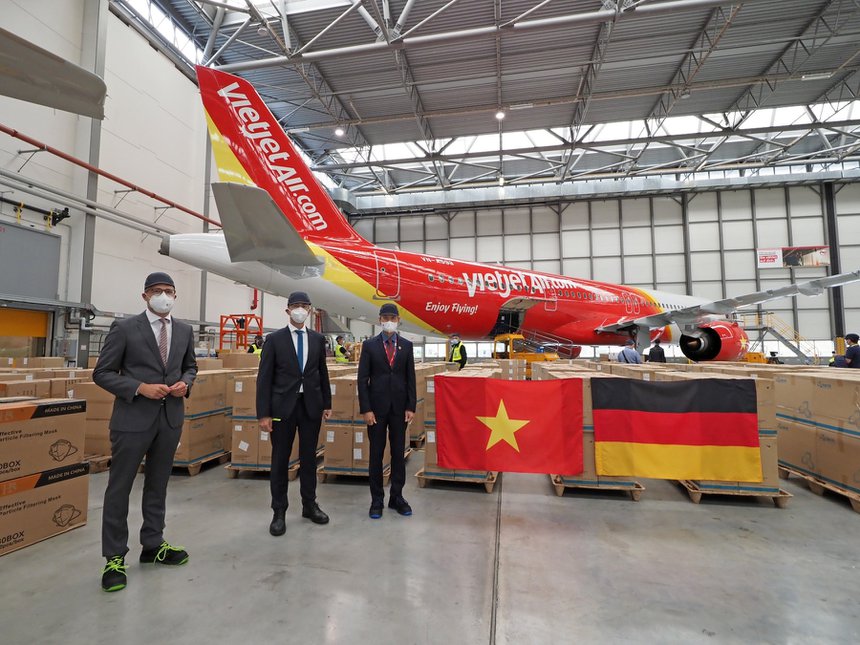 Tại thành phố Hamburg (Đức), chuyến bay miễn phí của Vietjet tiếp nhận thiết bị y tế do các tổ chức, doanh nghiệp và cá nhân ở châu Âu ủng hộ Việt Nam phòng, chống dịch Covid-19.