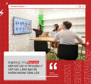 – Nestlé chú trọng xây dựng văn hóa và môi trường bình đẳng dựa trên giá trị về tôn trọng sự khác biệt và các nguyên tắc trao quyền cho phụ nữ tại công ty. Cụ thể, tỷ lệ nữ giới nắm các vị trí trong Ban giám đốc và lãnh đạo là 55%, vượt số lượng nam đồng nghiệp.