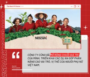 Công ty cũng mở rộng việc ưu tiên bình đẳng giới trong toàn chuỗi giá trị của mình, điển hình là dự án phát triển cà phê bền vững NESCAFÉ Plan – “Nestlé đồng hành cùng phụ nữ”. Dự án đã góp phần nâng cao vai trò, vị thế của người phụ nữ, thông qua việc đào tạo đội ngũ nữ trưởng nhóm nông dân trồng cà phê. Trong quản lý kinh tế nông hộ, hơn 80% phụ nữ tham gia vào các quyết định đầu tư và sản xuất, cũng như quản lý các báo cáo về tài chính.