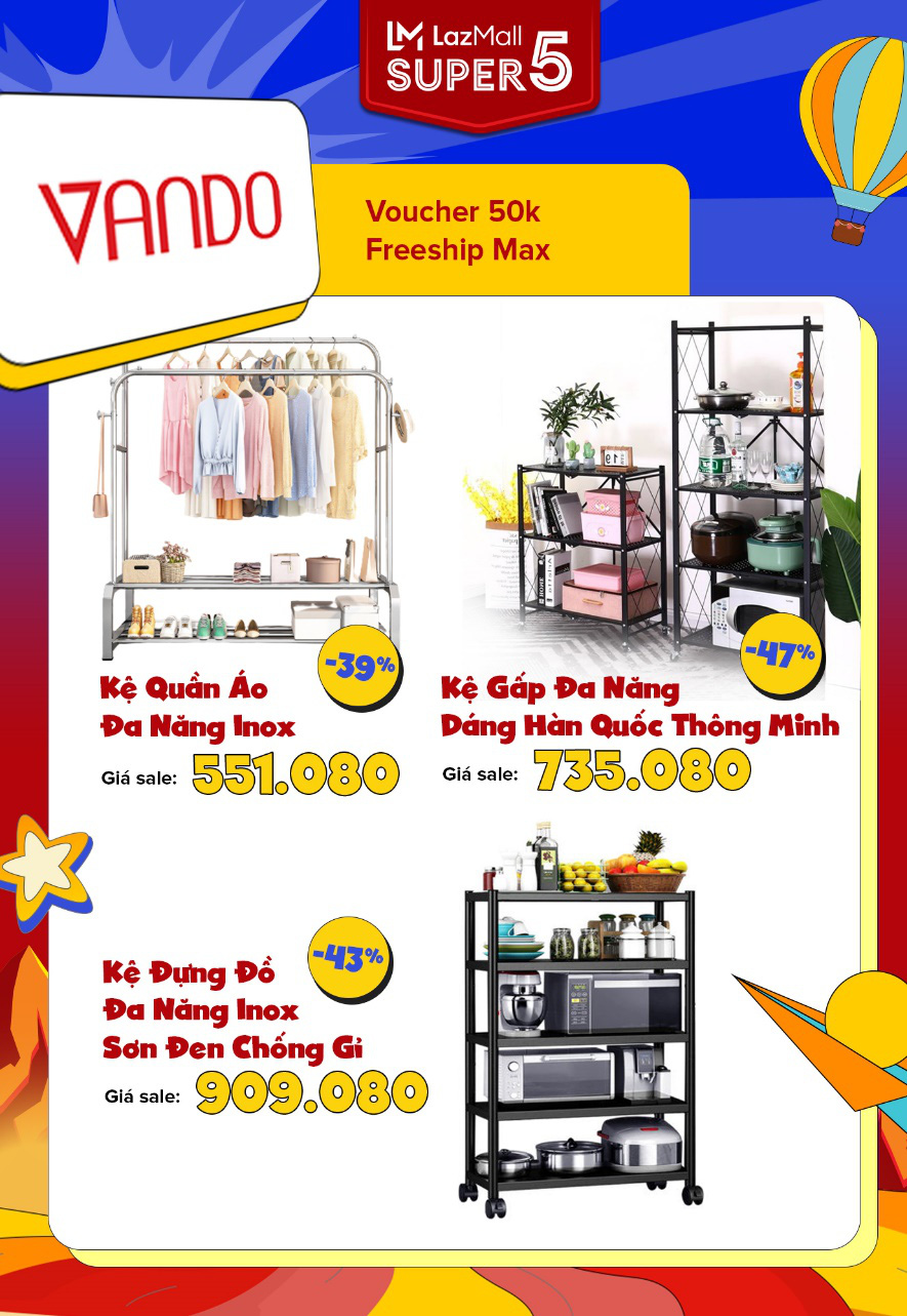 Ra mắt thị trường từ năm 2015, Vando đã phân phối hàng triệu sản phẩm giá, kệ, đồ tiện ích thông minh đáp ứng nhu cầu tái thiết kế đồ đạc, không gian khoa học với chi phí tối ưu nhất. Đến mua sắm trong siêu hội LazMall Super5, hội nghiện nhà có thể dễ dàng mua sắm hàng loạt kệ thông minh, kệ đa năng để sẵn sàng tận hưởng không gian nhà ngăn nắp, rộng thoáng hơn kèm ưu đãi voucher 50k.