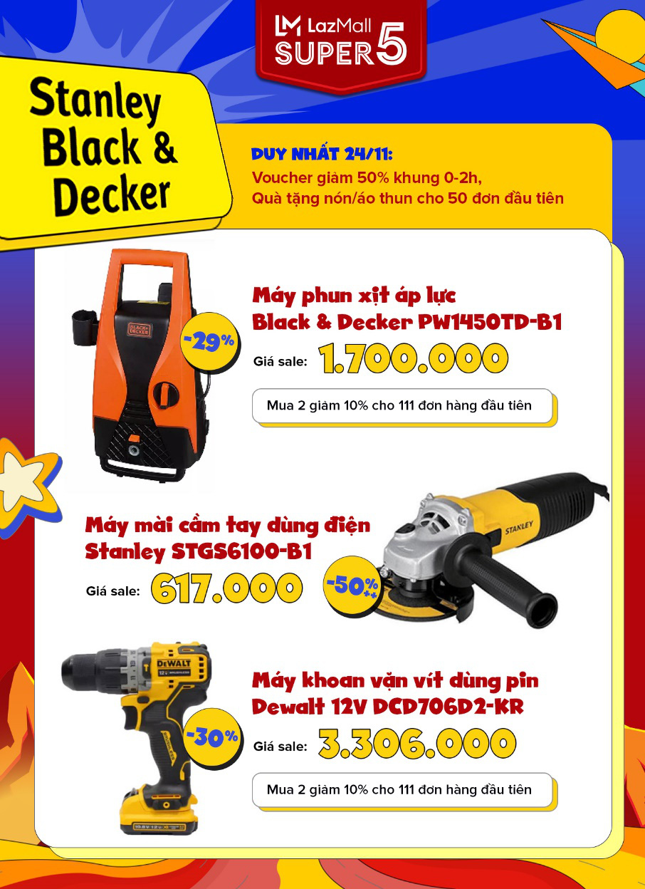 Không chỉ là ngày hội cho bà nội trợ, tại LazMall Super5, đấng mày râu cũng được thỏa mãn đam mê xây tổ ấm với ưu đãi từ gian hàng chính hãng của thương hiệu Stanley Black & Decker Dewalt trên LazMall. Được biết đến là thương hiệu cung cấp dụng cụ cầm tay hàng đầu thế giới, các sản phẩm xuất xứ từ Mỹ này đều đáp ứng độ tiện dụng và kết hợp các công nghệ giúp cải thiện chất lượng cuộc sống người dùng. Vào 24/11, khi mua sắm các sản phẩm của Stanley Black & Decker Dewalt, các anh không chỉ hưởng mức giảm 49%++ trong khung giờ vàng 0-2h, mà còn nhận ưu đãi quà tặng cho 50 đơn đầu tiên kèm chương trình mua 2 giảm thêm 10% cho 111 đơn hàng đầu tiên.