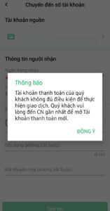 Đồng thời, hệ thống VPBank đã hiển thị thông báo “Tài khoản thanh toán của quý khách không đủ điều kiện để thực hiện giao dịch. Quý khách vui lòng dến chi nhánh gần nhất để mở Tài khoản thanh toán mới”.
