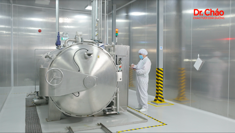 Sau khi đóng gói, các nguyên liệu được nấu chín trực tiếp trong bao bì bằng công nghệ Retort – Hấp Tiệt Trùng. Quá trình nấu chín trải qua 3 giai đoạn để cháo được chín đều. Tiếp theo, sản phẩm được giữ ở nhiệt độ và áp suất tiệt trùng để cháo được nấu chín và tiệt trùng, đảm bảo vệ sinh an toàn thực phẩm và tươi ngon. Sau chu kỳ làm nguội, sản phẩm được chuyển đến kho thành phẩm để bảo ôn, ổn định hoàn thiện chất lượng trước khi đưa đến tay người tiêu dùng.