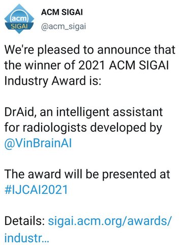 Sản phẩm DrAid for Radiology của VinBrain (thuộc Tập đoàn Vingroup) đã đạt giải ACM SIGAI 2021 ở hạng mục sản phẩm ứng dụng trí tuệ nhân tạo (AI) xuất sắc.