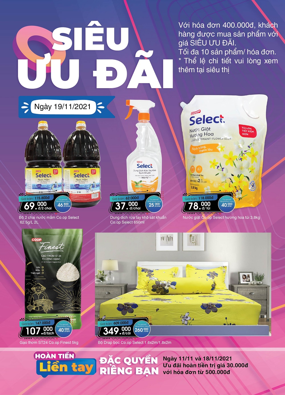 Ngoài ra, vào các ngày cuối tuần, từ 19/11 đến 21/11/2021, khách hàng có cơ hội “săn” sale các sản phẩm hóa phẩm và thực phẩm công nghệ trong chương trình “Siêu ưu đãi” với hóa đơn từ 400.000 đồng trở lên gồm: nước giải khát Coca Cola/Sprite lon 3x320ml còn 3.000 đồng/3 lon, hạt nêm Knorr thịt thăn xương ống và tủy 400g còn 5.000 đồng/gói, 2 hộp creamer đặc NutiMilk hộp thiếc 380g còn 15.000 đồng/2 hộp, thực phẩm bổ sung dinh dưỡng Anlene Gold 3X cafe hộp giấy 310g còn 53.000 đồng/hộp, bộ 2 chai nước mắm Co.op Select 62,5g/L 2L còn 69.000 đồng/2 chai, gạo thơm ST24 Co.op Finest 5kg còn 107.000 đồng/bịch, cà phê hòa tan 3in1 Gold Vina 40x20g còn 45.000 đồng/bịch, nước giặt Lix hương nước hoa 3,8kg còn 89.000 đồng/chai, nước rửa chén Lix trà xanh 3,6/4kg còn 49.000 đồng/chai, dầu gội đầu Pantene ngăn rụng tóc 900g còn 105.000 đồng/chai, nước xả Comfort 1 lần xả hương ban mai túi 3,2L còn 129.000 đồng/túi, bộ drap bọc Co.op Select 1,6x2m/1,8x2m còn 349.000 đồng/cái…