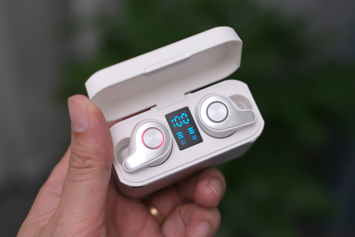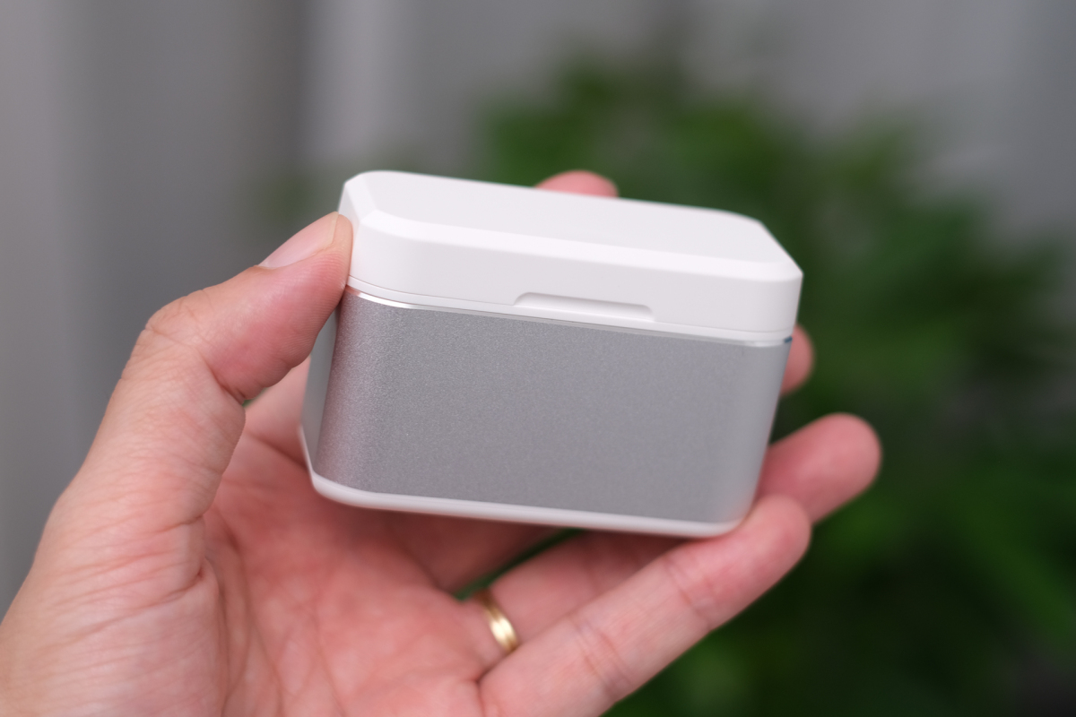 Thiết kế hộp độc đáo khi có màn hình LCD phía trong. Ngoài hiển thị dung lượng pin, hai vạch hai bên báo trạng thái pin và trạng thái sạc của từng bên tai nghe. Trong khi đó, đa số các mẫu tai nghe True Wireless khác chỉ có đèn LED nhỏ để báo trạng thái qua màu sắc như đỏ, xanh vàng. Hệ thống sẽ tự tắt khi pin đầy, tránh làm chai pin.