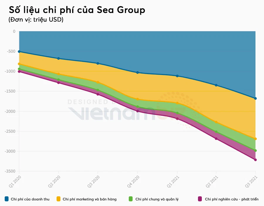 Các chi phí của Sea đều có xu hướng tăng mạnh trong quý 3/2021. (Nguồn: Sea/Tech in Asia, Việt hoá: Thái Sơn).