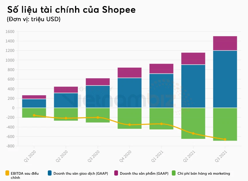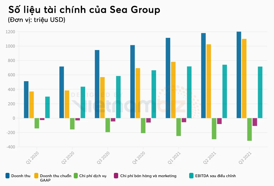 Doanh thu của Sea tăng 122% lên mốc 2,86 tỷ USD, chủ yếu nhờ cả ba mảng kinh doanh cốt lõi là trò chơi trực tuyến, thương mại điện tử và tài chính số đều tăng trưởng mạnh. Riêng doanh thu mảng TMĐT của Sea đã tăng 134% so với cùng kỳ năm ngoái lên mốc 1,5 tỷ USD. Dù vậy, chi phí marketing cho mảng này cũng tăng mạnh 125% (688 triệu USD).