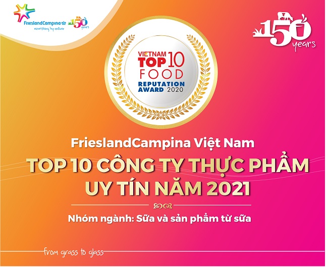 Trong khi đó, dựa vào các kết quả nghiên cứu độc lập của Vietnam Report dành cho các doanh nghiệp ngành thực phẩm – đồ uống, tập đoàn sữa đa quốc gia hàng đầu thế giới FrieslandCampina đã lọt “Top 10 công ty uy tín ngành thực phẩm – đồ uống năm 2021”. Giải thưởng của Công ty cổ phần Báo cáo đánh giá Việt Nam (Vietnam Report) đã dựa trên 3 tiêu chí chính: Năng lực tài chính, uy tín truyền thông, khảo sát ý kiến các đối tượng liên quan (người tiêu dùng, khách hàng…).