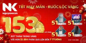 Nhân dịp đón chào năm mới 2022, Nguyễn Kim chính thức thực hiện chương trình khuyến mãi “Tết may mắn – Rước lộc vàng”. Đây không chỉ là dịp người tiêu dùng “lên đời”, chọn lựa đồ dùng, thiết bị mới cho gia đình mà còn là lúc tận hưởng những ưu đãi cực kì hấp dẫn. Đặc biệt, trong lần mua sắm đầu năm này, khách hàng sẽ được tham gia rút thăm may mắn với số lượng “khủng” 153 chỉ vàng cùng 22.000 phần quà giá trị lên tới 7 tỷ đồng bao gồm: 51 tủ lạnh; 51 màn hình; 51 máy xay sữa hạt, 51 loa tháp và loa thanh…