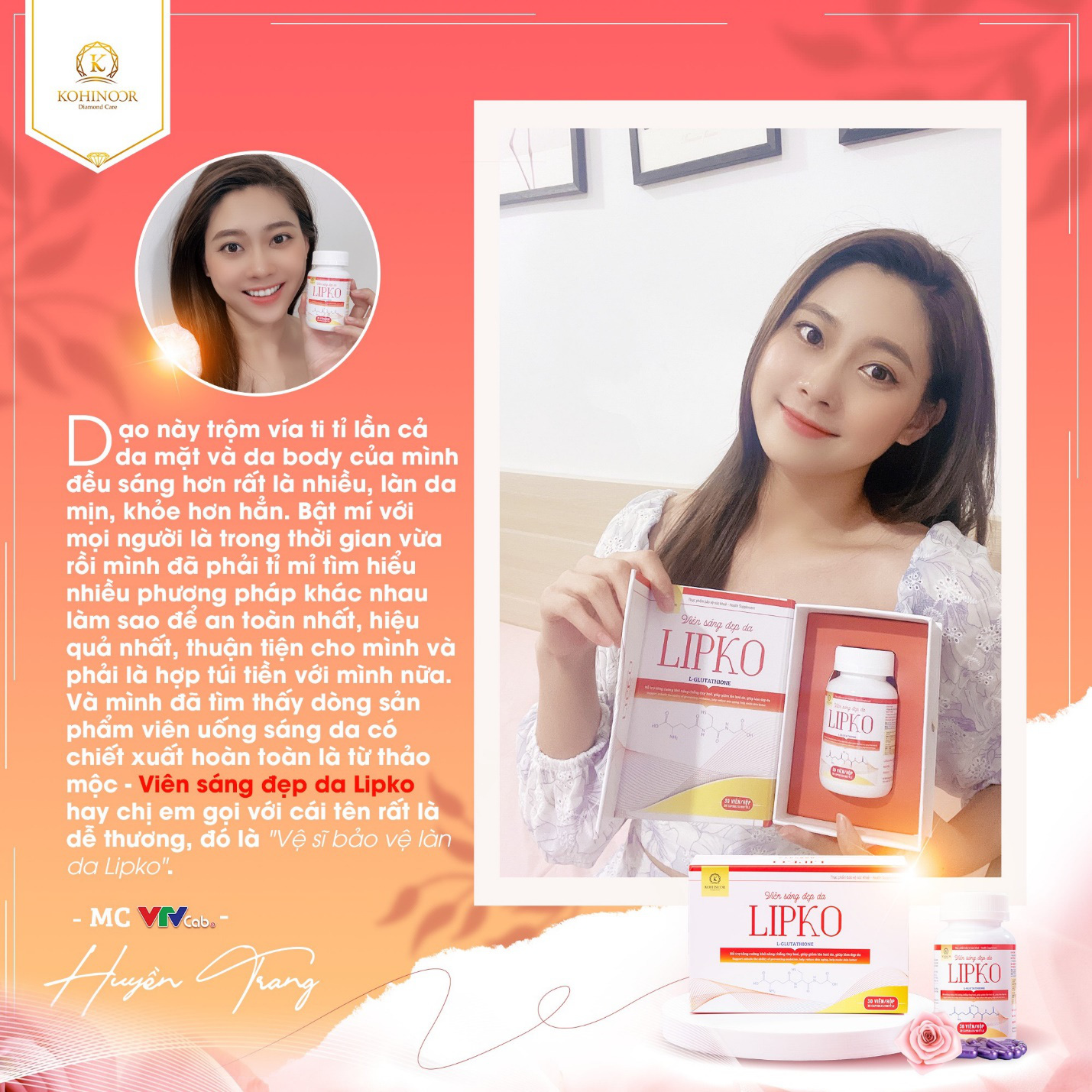 Cũng là một tín đồ say đắm TPBVSK viên uống sáng da Lipko, MC Mù Tạt nổi danh nhà đài với làn da mộc căng mịn, trắng hồng. Cô nàng Trang trong phim “11 tháng 5 ngày” cảm thấy thích thú vì lượng Vitamin C dồi dào mà sản phẩm cung cấp cho cơ thể: “Sắp bước sang ngưỡng cửa 30, Trang nhận thấy cơ thể bắt đầu có sự lão hóa, làn da không được cung cấp đủ chất sẽ rất khô, nứt nẻ. Không chỉ da mặt mà da cổ, da tay cũng gặp tình trạng thô ráp vào những ngày Hà Nội sang đông.