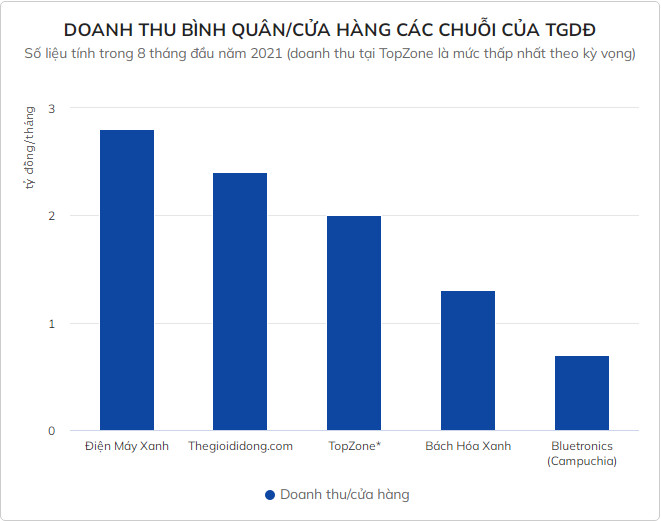 Đây là mức thu tương đối cao nếu so với doanh thu bình quân tháng các chuỗi bán lẻ hiện tại của TGDĐ đang vận hành. Trong đó, Thegioididong.com ghi nhận 2,4 tỷ đồng/tháng/cửa hàng; Điện Máy Xanh đạt 2,8 tỷ/cửa hàng; Bách Hóa Xanh là 1,3 tỷ/cửa hàng và Bluetronics là 0,7 tỷ/cửa hàng trong vòng 8 tháng từ đầu năm nay.