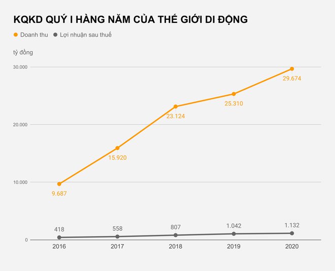 Tuy vẫn giữ được mức tăng trưởng lợi nhuận quý I nhưng so với mức tăng của năm liền trước (quý I/2019), đà tăng lợi nhuận sau thuế của Thế giới Di động năm nay chỉ tương đương 1/3.