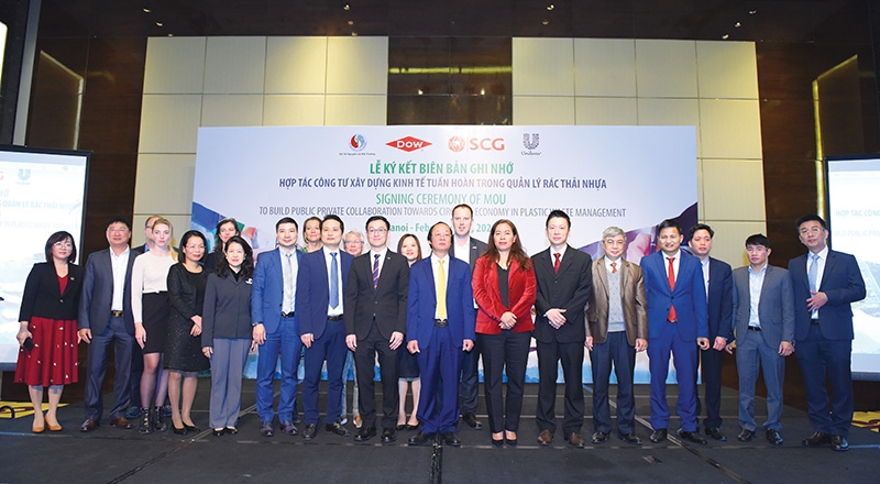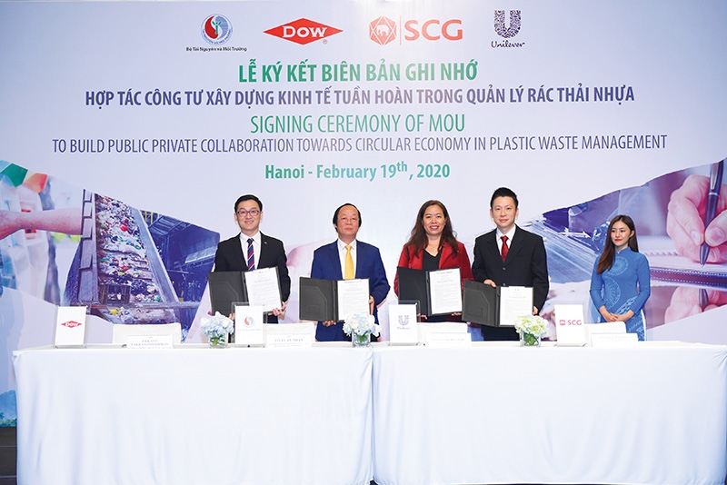 The ceremony to sign the MoU was attended by representatives of Dow Vietnam, SCG, and Unilever, as well as MoNRE Deputy Minister Vo Tuan Nhan (second from left)