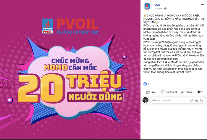 Tổng công ty Dầu Việt Nam đăng lời chúc mừng MoMo Ảnh chụp màn hình