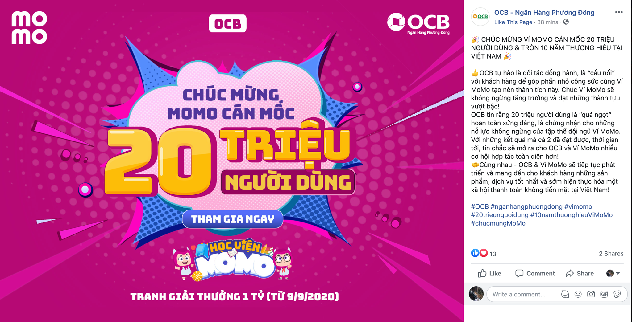 Ngân hàng OCB chúc mừng thành tích đạt 20 triệu người dùng của MoMo trên kênh Facebook Ảnh chụp màn hình