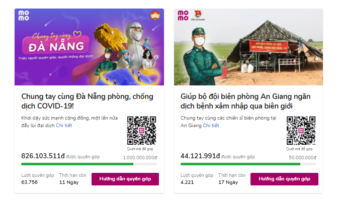 Từ đầu tháng 8, ví điện tử MoMo đã kết hợp cùng Ủy ban Mặt trận Tổ quốc thành phố Đà Nẵng và Tỉnh đoàn An Giang triển khai hai chiến dịch ý nghĩa là “Chung tay cùng Đà Nẵng” và “Giúp bộ đội biên phòng An Giang ngăn Covid-19 xâm nhập qua biên giới”. Hai chiến dịch kêu gọi người dùng quyên góp, đồng hành cùng cả nước chiến thắng đại dịch.