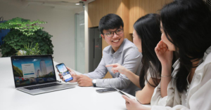 Nhân viên văn phòng tìm hiểu về hệ sinh thái tiện ích trên mobile banking. Ảnh: VNPAY