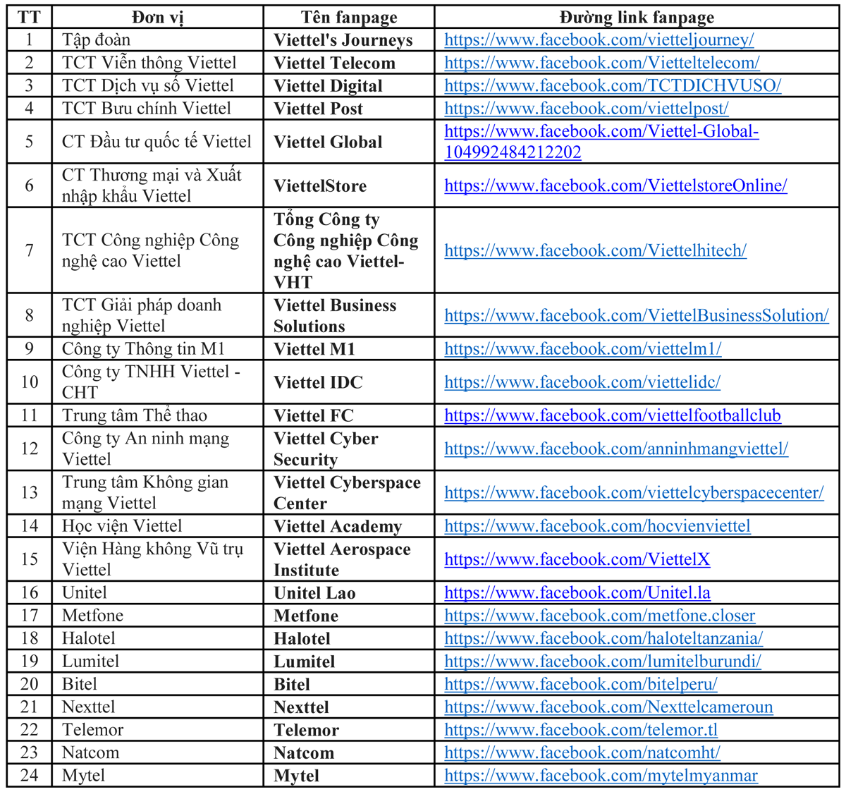 Danh sách các trang fanpage chính thức của Viettel được fanpage cấp dấu xác nhận: