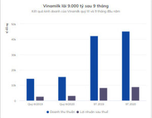 Lũy kế 9 tháng đầu năm, Vinamilk đạt doanh thu hợp nhất 45.277 tỷ đồng, lợi nhuận ròng 8.967 tỷ. Trung bình mỗi tháng, Vinamilk thu về hơn 5.000 tỷ và lãi gần 1.000 tỷ đồng. Công ty sữa lớn nhất Việt Nam tăng 7% về cả doanh thu và lợi nhuận so với cùng kỳ năm trước.
