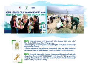 Bên cạnh tích cực chăm sóc dinh dưỡng, sức khỏe cho trẻ em, Vinamilk còn góp sức cùng thế hệ tương lai xây dựng môi trường sống trong lành và bền vững qua Quỹ 1 triệu cây xanh cho Việt Nam. Quỹ từng được Giải thưởng CSR toàn cầu 2020 (The Global CSR Awards 2020) vinh danh là “Top 10 hoạt động vì môi trường xuất sắc” cho nhiều đóng góp tích cực. Trải qua 9 năm, quỹ đã trồng hơn 1,121 triệu cây xanh tại 56 địa điểm thuộc 20 tỉnh, thành phố, tổng giá trị 12,5 tỷ đồng.