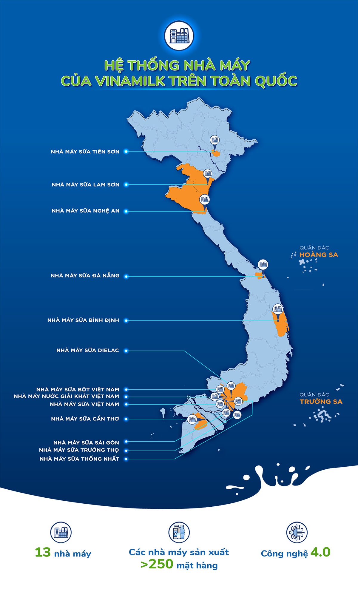 Từ 03 nhà máy ban đầu khi thành lập, đến nay, Vinamilk đang có 13 nhà máy trong nước được đầu tư quy mô và ứng dụng công nghệ hàng đầu thế giới. Hệ thống nhà máy này giúp Vinamilk có thể phát triển hơn 250 loại sản phẩm sữa thuộc 13 nhóm ngành hàng từ sữa đặc, sữa nước, sữa bột, sữa chua, kem, nước giải khát… Trong đó, có thể kể đến hai cái tên sáng giá là Nhà máy sữa Việt Nam và Nhà máy sữa bột Việt Nam, đều thuộc hàng “siêu nhà máy”. Cả 2 nhà máy này được Vinamilk đưa vào vận hành năm 2013, tạo nên sự đột phá lớn cho công ty trong giai đoạn phát triển sau đó.
